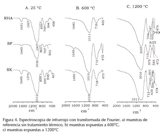 Para cada uno de los sistemas se identifica una amplia banda de gran intensidad comprendida entre 1200 y 800 cm1 (figura 4), la cual corresponde a la tensión asimétrica de los enlaces Si-O-T (donde T corresponde a tetraedros de Si o Al) (Granizo et al., 2007; Heah et al., 2013; Elimbi et al., 2011). Esta banda Si-O-T en el sistema SF se encuentra a longitudes ligeramente mayores (1016 cm1) en comparación con lo exhibido por RHA y SK (cuyas señales están ubicadas a 1007 cm1 y 1012 cm1, respectivamente), lo cual podría atribuirse a la presencia de Si cristalina que no se ha disuelto por el entorno alcalino (Bernal et al., 2012). Esta banda independientemente del tipo de activador utilizado, así como la temperatura de exposición se centra a 1015 cm1, la cual se asigna al modo de vibración de los enlaces Si-O-Si. Las señales correspondientes a la vibración por flexión de los enlaces Si-O-Si se detectan a 460 cm1 y su correspondiente vibración asimétrica está ubicada a 800 cm1 contribuyendo con la intensidad del pico Si-O-T. La señal para los sistemas activados con las diferentes fuentes de sílice sin haber sido expuestos a altas temperaturas (espectros de la figura 4a) presenta señales entre 590-595 cm1 atribuidas a las vibraciones por tensión simétrica de Si-O-Al (Panagiotopoulou et al., 2006) y la señal identificada a ~860 cm1 corresponde a la vibración por tensión asimétrica del Al coordinado tetraédricamente presente en el gel formado y el cual es característico en este tipo de materiales (Granizo et al., 2007). Las señales identificadas a ~710 cm1 corresponden al estiramiento de los enlaces Si-O-Si(Al) cuyas intensidades evidencian un elevado grado de sustitución de Al en el gel rico en Si, característico de la formación de polímeros amorfos (Granizo et al., 2007; Heah et al., 2013; Elimbi et al., 2011). De igual manera, con esta condición (25°C) se aprecia una banda ubicada a ~1650 cm1 correspondiente a los modos de vibración por tensión de las bandas de H-OH en las moléculas de agua asociadas a los productos de reacción (Elimbi et al., 2011).