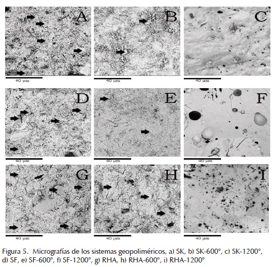En las micrografías de cada uno de los sistemas geopoliméricos sin tratamiento térmico (figuras 5a, d y g) se puede apreciar la presencia de partículas de MK sin reaccionar y embebidas en el gel (tal como se indica en cada micrografía) y la obtención de un material de elevada porosidad. Conforme se incrementa la temperatura de exposición se observa de manera general una densificación estructural como consecuencia de la deshidratación de los productos formados y los cambios estructurales generados. Para los sistemas SF y RHA expuestos a 1200°C (figuras 5f y 5i, respectivamente) se identifica el crecimiento de grietas, las cuales se generan por efecto de los esfuerzos de contracción capilar durante la deshidratación y deshidroxilación del material. La presencia de dichas grietas en menor proporción para el caso de SK puede atribuirse a una mejor distribución de la pérdida de agua en la estructura. Estas grietas pueden conducir a una disminución de las resistencias mecánicas, las cuales pueden reducirse a través de la incorporación de partículas con una elevada estabilidad térmica, tales como alúmina o circonio (Kamseu et al., 2010), mediante la inclusión de fibras cerámicas o la aplicación de presión durante los procesos de fabricación del geopolímero (Xie et al., 2019). Los poros de gran tamaño identificados en las muestras expuestas a 1200°C se atribuyen a los espacios que quedan como consecuencia de la evaporación del agua y la retracción posterior del material. Las micrografías obtenidas no revelan la presencia de los cristales de leucita o kalsilita, identificados a través de XRD, probablemente debido a que pueden estar dispersos y embebidos en el gel sinterizado. El crecimiento e identificación de dichas estructuras a través de SEM se favorece conforme se incrementan los tiempos de exposición a temperaturas superiores a los 1000°C (Bell et al., 2009).