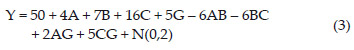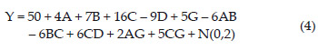 • Paso 7. Las posibles interacciones de control por control se incrementaron a seis, AB, AC, AD, BC, BD y CD; por lo tanto se declararon tres de ellas significativas, AB, BC y CD. En cuanto a las interacciones de control por ruido, estas no se incrementaron como previamente se indicó en la metodología, por tanto son 2 y corresponden a AG y CG, es así como queda establecido el siguiente modelo.