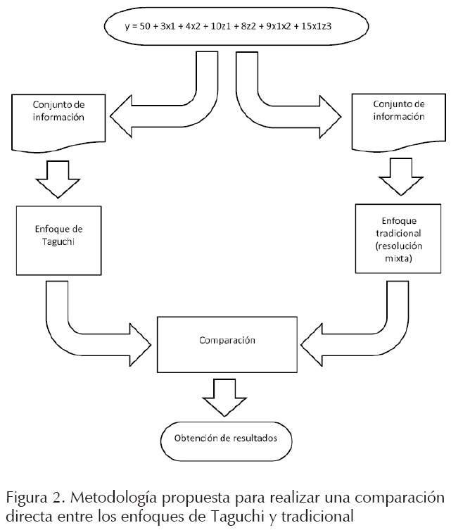 La metodología que se utilizó fue en esencia una comparación directa entre los dos enfoques de experimentación a través de indicadores de desempeño, que son estadísticos comúnmente utilizados en la evaluación de diseños de experimentos, donde previamente se colocaron los arreglos cruzados de Taguchi en forma estándar para simplificar su análisis y lograr una comparación directa contra el enfoque tradicional.