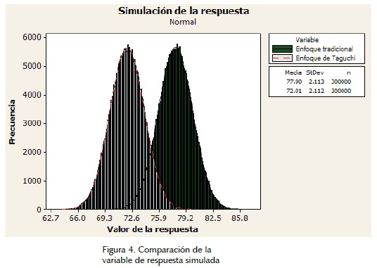 Una vez que se obtuvieron los niveles recomendados para los factores de control que maximizaban la variable respuesta para cada enfoque de diseño experimental, se simularon 300,000 respuestas para cada enfoque de la siguiente manera: los niveles de los factores de control recomendados para cada enfoque se sustituyeron en la ecuación (4) y los niveles para los factores de ruido y el error se variaron en forma aleatoria durante la simulación, para emular un proceso real, lo que dio lugar a dos histogramas diferentes que representan la distribución de la variable de respuesta dentro de cada enfoque. Estos histogramas se analizaron para conocer los niveles de variabilidad, media y desviación estándar generados por cada metodología. De la misma manera se determinó qué metodología optimizó de forma más eficiente la variable de respuesta. La figura 4 presenta los histogramas generados.