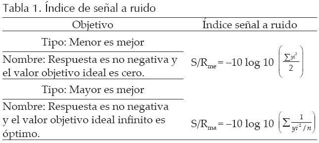Los arreglos cruzados de Taguchi se optimizaron utilizando el software Qualitek-4, el proceso de búsqueda que utiliza este software es el índice de señal a ruido, dependiendo del valor objetivo de la variable de respuesta, mayor es mejor (maximizar) o menor es mejor (minimizar), dicho procedimiento pretende encontrar el valor alto o bajo (entre 1 y 1) al que debe colocarse cada variable. Los índices de señal a ruido propuestos por Taguchi se observan en la tabla 1 (Castaño y Domínguez, 2010).