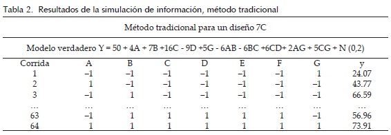 Se generó de la misma manera a partir del modelo verdadero (4), el diseño utilizado corresponde al 271 de la tabla de diseños de resolución mixta de Lucas y Borkowski (1997), el cual recibe el nombre de diseño 7C. El diseño 7C contiene 7 variables, de las cuales hasta 5 pueden ser de control y 2 de ruido, es un diseño fraccionado 271 de resolución VII. La tabla 2 muestra un extracto del conjunto de información generado.