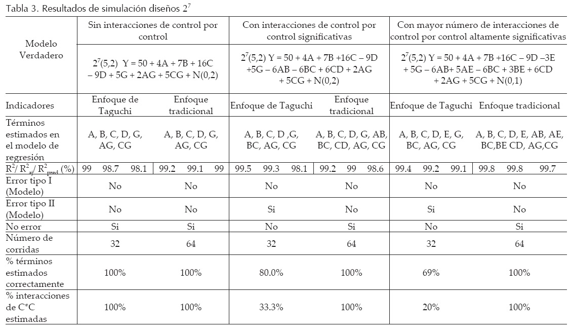 Como se puede observar en la tabla 6, al comparar los resultados de ambas metodologías, se nota una diferencia porcentual bastante significativa en la capacidad para estimar interacciones de control por control por parte del enfoque de Taguchi. Esta tendencia de reducción de la capacidad para estimar estas las interacciones se incrementa cuando los modelos simulados se saturan con interacciones de control por control.