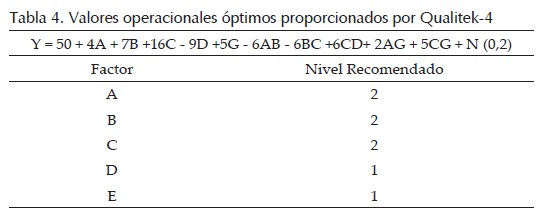 El procedimiento que se siguió para optimizar las variables de respuesta para los conjuntos de información generados bajo el enfoque de Taguchi fue utilizar arreglos cruzados y mediante ayuda del software Qualitek-4, se lograron obtener las condiciones de operación óptimas. Observe que este modelo corresponde a un 27 que contiene 5 factores de control y 2 de ruido, por lo que es necesario utilizar un arreglo L8 (arreglo interno) y un L4 (arreglo externo). El objetivo es maximizar la respuesta, es decir, un mayor es mejor; el proceso de optimización al utilizar el software es automático. Las condiciones de operación óptimas obtenidas se muestran en la tabla 4, note que el software recomienda colocar las variables A, B y C a nivel alto y las variables, E y D, a nivel bajo.