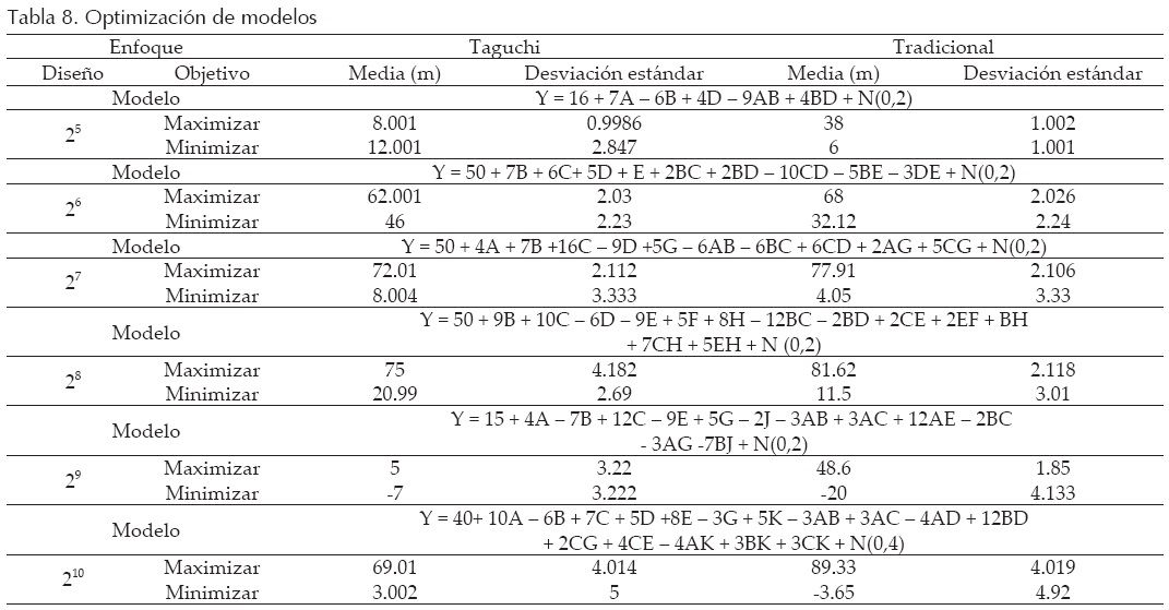 Modelos específicos que contenían interacciones de control por control fueron seleccionados, estos modelos pudieron dar una respuesta muy clara de las diferencias entre ambos enfoques al momento de optimizar las respuestas. Los procesos de optimización se realizaron para cada uno de los modelos: 24, 25... hasta el 210. El conjunto de resultados obtenidos se muestran en la tabla 8; esta tabla muestra el resumen de las optimizaciones con la media y la desviación estándar de las 300,000 variables de respuesta simuladas para cada modelo dentro de cada enfoque y para cada objetivo, maximización o minimización.