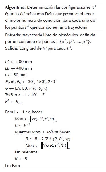 Encontrar el valor para el parámetro R que permita obtener el mínimo número de condición k para una determinada pose del robot P bajo ciertos parámetros geométricos constantes (r, LA, LB, θi), se puede ver como un problema de optimización.