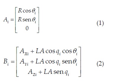 Como se observa en la figura 1b, un sistema de referencia global (X, Y, Z) se define en el punto O en el centro de la base fija. Los ejes X y Y yacen en el plano de la base fija y el eje Z apunta hacia arriba verticalmente. Las articulaciones activas de revoluta, cuyas posiciones se definen por los vectores OAi, forman un triángulo equilátero A1A2A3(figura 1c), donde Ai= (AXi, AYi, AZi) depende del radio R de la circunferencia donde está inscrito el triángulo y de la orientación θi de las i =1, 2, 3 cadenas cinemáticas. Por otro lado, Bi= (BXi, BYi, BZi) denota la posición, definida por el vector OBi, de la articulación que conecta el eslabón de longitud LA con el eslabón de longitud LB (en forma de paralelogramo) en la misma cadena cinemática. De forma similar, Ci= (CXi, CYi, CZi) denota la posición, definida por el vector OCi, de la articulación que conecta la base móvil con el eslabón de longitud LB. Los puntos Ci forman un triángulo equilátero C1 C2 C3 inscrito en una circunferencia de radio r (figura 1c). Los ejes de rotación de las articulaciones de revoluta activas, definidos como