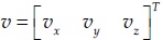 El estado de velocidad V de un cuerpo rígido se puede expresar con tres componentes angulares (wx, wy, wz) y tres lineales (vx, vy, vz). En el caso del estado de velocidad de la base móvil del robot tipo Delta, las componentes angulares se consideran nulas, pues se trata de un mecanismo de tres grados de libertad puramente traslacionales, por lo que su estado de velocidad se puede representar como sigue