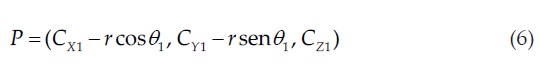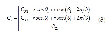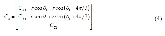 Para determinar las coordenadas de los puntos Ci= (CXi,CYi,CZi) es necesario considerar que si C1C2C3 es un triángulo equilátero inscrito en una circunferencia de radio r, entonces las coordenadas de C2 y C3 se pueden especificar en función de las coordenadas de C1, como se presenta a continuación