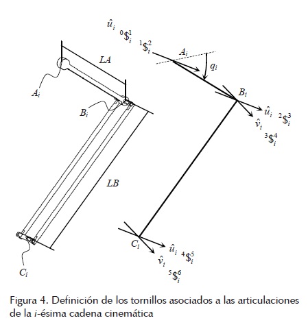 Matriz jacobiana: con el propósito de evitar una matriz jacobiana con rango deficiente, pares cinemáticos virtuales se añaden al mecanismo. Tomando en cuenta esto, los tornillos asociados con cada una de las articulaciones de la i-ésima cadena cinemática (figura 4) son:
