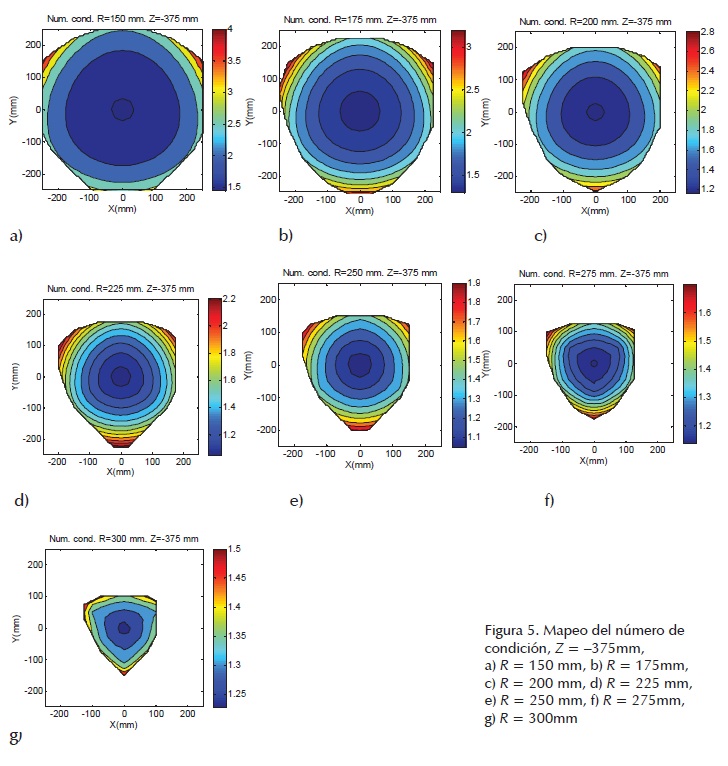 Cada variación del parámetro R implica una configuración distinta del robot y en consecuencia un determinado espacio de trabajo (ver figura 3). Se realizó el cálculo del número de condición para todos los puntos dada una determinada configuración del parámetro R, los resultados son muchos y por ello en la figura 5 se presentan únicamente resultados para un plano que pertenece al espacio de trabajo útil del robot (Z = 375 mm). Las variaciones del parámetro geométrico R van desde 150 hasta 300 mm con incrementos de 25 mm.