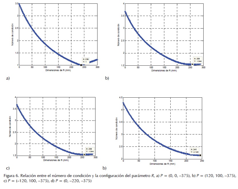 En la figura 6 se muestra, para todas las poses presentadas, que el número de condición tiende a mejorar en la medida que se incrementa el valor de R, hasta llegar a un punto donde ya no es posible mejorar. En el caso de la figura 6a, la cual corresponde al análisis para el punto P = (0, 0, 375), la configuración que ofrece el mejor número de condición se da cuando R es de aproximadamente 238 mm y corresponde a un número de condición de 1, cuando con la configuración de referencia R = 150 mm el número de condición es de 1.45. Por otro lado, en las figura 6b y 6c, las cuales corresponden al análisis de los puntos P = (120, 100, 375) y P = (120, 100, 375), el comportamiento del número de condición es el mismo, lo cual es lógico pues el comportamiento general del número de condición es simétrico con respecto al eje Y. En ambas figuras la configuración que ofrece el mejor número de condición se da cuando R es de aproximadamente 258 mm y corresponde a un número de condición de 1.544, cuando con la configuración de referencia R = 150 mm el número de condición es de 1.8. Finalmente, en la figura 6c, la cual corresponde al análisis del punto P = (0, 220, 375), se observa un comportamiento similar, con un valor de R = 245 mm el número de condición es de 2.148, cuando con la configuración de referencia R = 150 mm el número de condición es de 2.41. La curva de la figura 6c se vuelve discontinua a partir de R = 245 mm, lo cual significa que el punto P = (0, 220, 375) no puede alcanzarlo el robot con configuraciones superiores a R =245 mm.