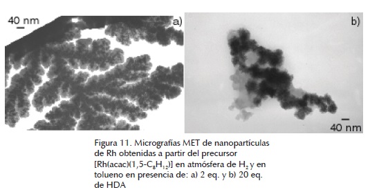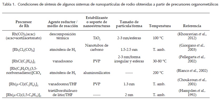 En la literatura existen pocos estudios de la síntesis de nanopartículas de Rh a partir de precursores organometálicos (tabla 1). Se muestran algunos ejemplos en la tabla 1.