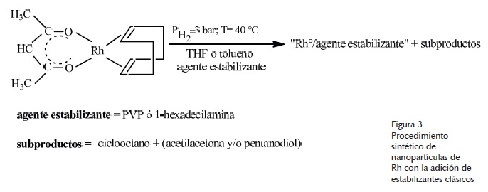 Por lo tanto, en este trabajo se incluyen los resultados obtenidos del estudio de la influencia de la acetilacetona, del 2,4-pentanodiol y del ciclooctano en la estabilización, la forma y la dispersión de las nanopartículas de Rh obtenidas a partir del complejo [Rh(acac)(1,5-C8H12)]. De igual manera, se efectuaron experimentos con algunos agentes estabilizantes clásicos.