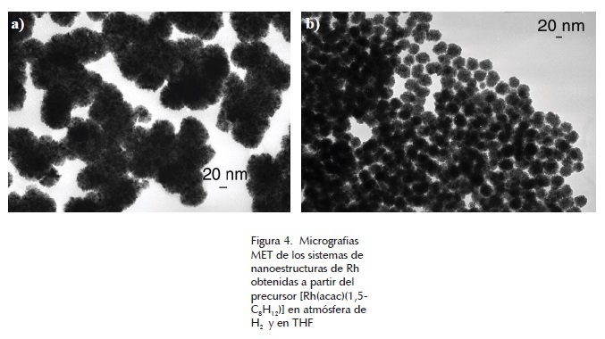 En los dos casos, las partículas presentaron una morfología semiesférica de apariencia esponjosa en su superficie y una mala dispersión entre ellas. Este aspecto esponjoso de las partículas puede atribuirse a una estabilización poco eficaz que favorece la formación de agregados de cristales. Este fenómeno se ha observado en el caso de rutenio, paladio (Ramirez et al., 2004) y recientemente en nanoestructuras también de rodio obtenidas por una metodología diferente a partir de RhCl3 (Gacem et al., 2013). En este último, se sugiere que la formación de este tipo de estructuras se lleva a cabo en dos etapas, la primera en la reducción rápida de Rh3+ con la adición de NaBH4 y la segunda, durante el ensamblaje de los átomos de Rh en organizaciones esféricas. En el caso particular de nuestro sistema, no se tiene la adición de NaBH4, sin embargo, también se sugiere que la formación de este tipo de organizaciones esféricas obtenidas se lleve a cabo en dos etapa: i) liberación rápida de los átomos de Rh de su esfera de coordinación gracias a la acción del H2 en la reacción y ii) ensamblaje de los átomos de Rh en organizaciones esféricas por la acción coordinante del disolvente, THF.