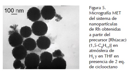 La obtención de nanopartículas de Rh obtenidas a partir del precursor [Rh(acac)(1,5-C8H12)] en medio orgánico y sin la adición de estabilizantes resulta ser no reproducible debido a la complejidad del medio durante la descomposición del precursor. Se cree que esta complejidad se genera por la presencia del acetilacetonato y del 2,4-pentanodiol, ambos formados a partir de la acetilacetona, y el ciclooctano, formado a partir del ciclooctadieno por acción del H2, lo cual provoca una solución tipo emulsión, en la que gotas suspendidas de ciclooctano de diferentes tamaños parecen actuar como pequeños reactores en el seno de los cuales se forman las nanopartículas.