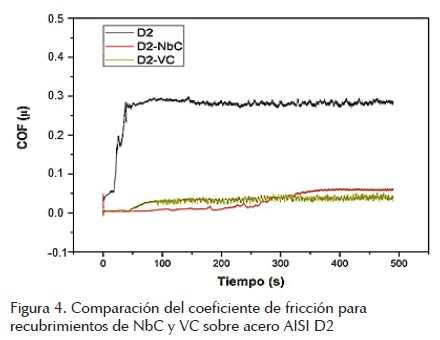 La figura 4 muestra el coeficiente de fricción (COF) de cada recubrimiento producidos en el ensayo de desgaste de esfera sobre disco. Se observa que el comportamiento tribológico cambia en el recubrimiento de NbC y VC sobre el acero D2 con relación al acero sin recubrir, con variaciones del COF desde 0.02 hasta 0.1 y con un comportamiento estable a lo largo del tratamiento. Para el acero D2 sin recubrir el valor obtenido del coeficiente de fricción es 0.35, además la variación fue muy grande en la fricción durante la prueba y puede atribuirse a diferencias en la estructura de la película o irregularidades en la superficie debido a la rugosidad (Arai, 1991; Sen, 2005).