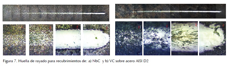 La figura 6 muestra el resultado de un ensayo de adhesión para ambas muestras. Se identifica la carga inicial (Lcl), la fase de aplicación de la carga y el sitio donde la carga crítica (Lc2) genera falla y delaminación del recubrimiento. Para el recubrimiento D2-Nb, la falla inicial Lcl comienza en torno de 41 N en un tiempo de 27 s evidenciando un tipo de falla cohesiva por el carácter duro del recubrimiento debido al desconchamiento (Bucking Spallation) en donde aún no hay desprendimiento, lo cual se observa en la figura 7a. La falla crítica Lc2 se produce en torno a 60 N en donde comienza la exposición del sustrato por la delaminación total del recubrimiento y una alteración en el comportamiento del COF con presencia de falla adhesiva (Sadumann et al., 2005; Sen y Sen, 2007).