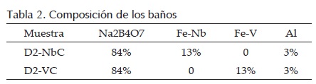 Las muestras se perforaron cerca del borde para colgarlas e introducirlas en el baño de bórax, se utiliza especialmente esta sal por su capacidad para disolver óxidos y su gran estabilidad térmica, bajo nivel evaporación, emisión de gases contaminantes y su bajo costo (Sen, 2004). En la tabla 2 se presenta la composición de los baños de sal utilizados durante el experimento. Se ha encontrado que a 1000°C el elemento formador de carburo se oxida con gran rapidez y forma oxido del metal agregado en la ferroaleación (vanadio o niobio), por lo tanto, no es posible obtener una capa de carburo; por esta razón se hace necesaria la utilización de un elemento reductor adicional que se encarga de reducir el bórax, evitar que se oxide el metal de transición aportado para favorecer la formación de los carburos deseados. El aluminio puro entre 1 y 10% (Patiphan y Prasonk) que se agrega en el baño de sales cumple el papel de agente reductor, es decir, que actúa como reductor del óxido de boro y se oxida para evitar que el metal agregado se oxide. De esta manera estos metales quedan libres para combinarse con el carbono del acero y formar carburos.