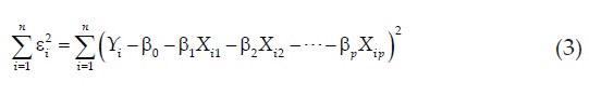 En la matriz X, Xij representa a la i-ésima observación o dato en la j-ésima variable independiente. El método de mínimos cuadrados de los residuos establece que la suma de los errores (εi) elevados al cuadrado debe ser minimizada, esto es