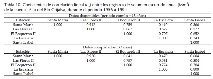 Por último, en la parte superior de la tabla 10 se muestran las correlaciones que tienen los registros de la tercera aplicación numérica, en el periodo común de 18 años de 1956 a 1973, definido este por los datos disponibles en la estación incompleta Santa Isabel. En la porción inferior de la tabla 10 se muestran las dependencias de los registros completados con base en las estimaciones del algoritmo de Beale-Little, se observa que todas las correlaciones de la estación Santa Isabel aumentan de manera importante, sobre todo con las estaciones más alejadas que son Santa María y Las Flores II.