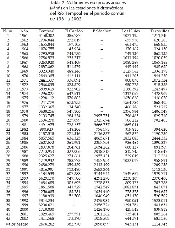 El río Tempoal pertenece a la Región Hidrológica Núm. 26 (Pánuco), es el último afluente importante del río Moctezuma que junto con el Tampaón forman el río Pánuco. En la figura 1 se muestra la morfología y localización geográfica del sistema del río Tempoal. En este río existen cinco estaciones hidrométricas, cuyos datos disponibles en el sistema BANDAS (IMTA, 2002), de volumen escurrido anual en millones de metros cúbicos (Mm3) se muestran en la tabla 2.