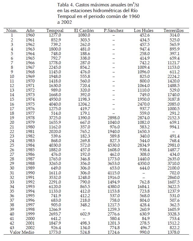 También se realiza en el sistema del río Tempoal, pero ahora se completan los datos disponibles de gasto máximo anual (m3/s), procedentes del sistema BANDAS (IMTA, 2002), los cuales se exponen en la tabla 4.