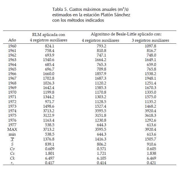 Se observa que los lapsos disponibles y los datos faltantes son escasamente diferentes a los de la aplicación anterior. Campos (2011a) utilizó la RLM para estimar la secuencia inicial de datos en la estación hidrométrica Platón Sánchez; la aplicó en el periodo común de 1978 a 2002, empleando 20 datos en los registros auxiliares. Como en los registros de gasto máximo anual no se puede aceptar que provengan de una distribución Normal, trabajó con los logaritmos naturales de los datos. Los resultados obtenidos se muestran en la segunda columna de la tabla 5.