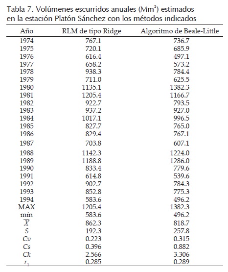 La aplicación del algoritmo de Beale-Little con n = 39 y p = 4, se realizó considerando faltantes los seis valores iniciales de las estaciones Santa María y Las Flores II; después de 95 ciclos estima los siguientes seis valores en la primera: 1467.4, 929.4,1208.4, 943.1,1203.7 y 859.9 Mm3 y estos seis en la segunda: 748.1, 335.5, 524.8, 251.9, 554.0 y 245.8 Mm3. La secuencia obtenida de 21 años en Santa Isabel se tiene en la tabla 7. Se observa que ambas series estimadas en Santa Isabel tienen el mismo comportamiento serial, pero la procedente del algoritmo de Beale-Little tiene mayor dispersión y sesgo, así como menor valor promedio.