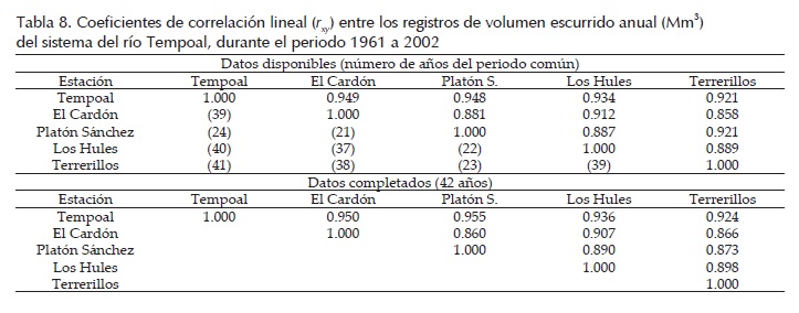 Los resultados mostrados en las tablas 3 y 5, tienen el mismo comportamiento secuencial de valores y ello genera confianza en tales estimaciones, ya que proceden de periodos comunes bastante diferentes. La similitud serial observada también se detecta en la semejanza que muestran los parámetros estadísticos, sobre todo los de la tabla 3; un poco menos en la tabla 5. Tal similitud se debe a la correlación general que guardan los registros procesados de volumen escurrido anual, la cual se muestra en la parte superior de la tabla 8 para los registros incompletos y en su parte inferior, para tales series completadas con los datos estimados con el algoritmo de Beale-Little.