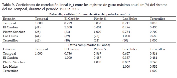 Respecto a la segunda aplicación numérica, en la tabla 9 se observa que la estimación de datos faltantes con el algoritmo de Beale-Little en la estación hidrométrica Platón Sánchez, mejora todas sus correlaciones con las otras estaciones, lo cual destaca la conveniencia de tal deducción. Lo contario ocurre en la estación Los Hules, cuyos valores estimados para los años 1990 y 1991 con el algoritmo de Beale-Little resultan con magnitud inversa a la que presentan las estaciones El Cardón, Terrerillos y Tempoal (tabla 4), y debido a ello su correlación disminuye al procesar los registros completos.