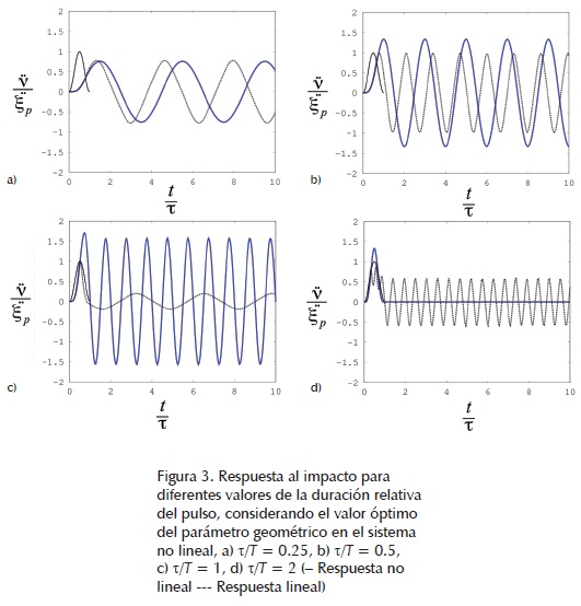 Para resolver la ecuación de movimiento del sistema se aplicó el método numérico de Runge-Kutta con ayuda de MATLAB. Se presenta a continuación la respuesta de aceleración máxima por ser el parámetro más importante para cuantificar la severidad del impacto. Estos resultados se presentan para cuatro valores característicos de la duración relativa del impacto τ/T en la figura 3, y se comparan con la respuesta del sistema lineal sometido al mismo pulso de entrada. Para el sistema no lineal, se considera el parámetro geométrico en su valor óptimo de 2/3. La respuesta se presenta normalizada tomando como referencia la máxima amplitud del pulso,