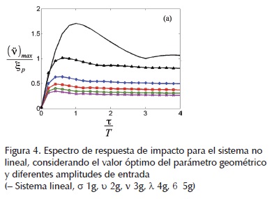 Se puede observar que la duración relativa del impacto juega un papel muy importante en la respuesta del sistema no lineal comparado con el sistema lineal. Para duraciones cortas, ambas respuestas son muy similares, dado que en esta zona la respuesta típica al impacto es de baja amplitud, por ende, el comportamiento no lineal se minimiza y se asemeja al del sistema lineal. Sin embargo, para duraciones medias, especialmente cuando la duración del pulso es igual al periodo natural, la respuesta del sistema no lineal es considerablemente menor y la respuesta residual, además de disminuir, presenta una oscilación de menor frecuencia, ya que el sistema tiene una rigidez dinámica menor. Para pulsos de mayor duración, la respuesta sigue de manera cercana la forma del pulso de entrada y de nuevo se observa que las respuestas de los sistemas lineal y no lineal son semejantes. Estos datos se pueden ver de manera más completa en la gráfica de espectro de impacto SRS presentada en la figura 4, donde se estudiaron diferentes niveles de amplitud del pulso de entrada. Se observa claramente la relación no lineal entre la entrada y la salida del sistema, dado que al aumentar la amplitud de entrada, la respuesta no aumenta en la misma proporción. De manera general, se puede decir que al incluir rigidez no lineal en el sistema de forma que dinámicamente se tenga una baja frecuencia natural, se puede reducir la respuesta de impacto en la zona crítica del SRS.