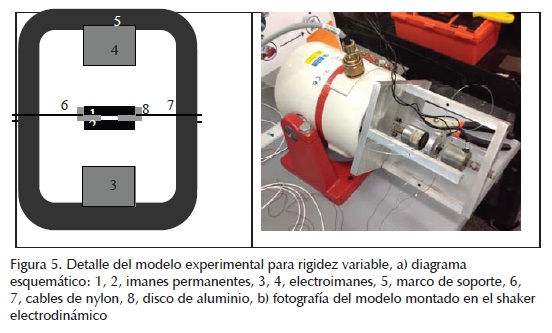 El dispositivo experimental presentado en la figura 5 se basa en un diseño previo presentado por los autores (Ledezma et al., 2012). En la figura 6 se muestra un diagrama y la figura 7 muestra una fotografía del sistema montado en un excitador electrodinámico. El sistema consta de una masa suspendida formada por un disco de aluminio y dos imanes permanentes de neodimio, sujetada por cuatro hilos de nylon a un soporte de aluminio. Alineado a los imanes permanentes se tienen dos electroimanes, uno en la parte superior y otro en la parte inferior. Se puede controlar la distancia entre imanes permanentes y electroimanes, así como el voltaje suministrado a estos últimos. La intención de este modelo es suspender la masa con resortes lineales y positivos (cables de nylon) y aprovechar la fuerza magnética de repulsión o atracción entre imanes permanentes y electroimanes como una fuerza de rigidez controlable. La masa total suspendida es de 0.075kg, y el voltaje máximo suministrado a los electroimanes fue de 20 VDC. Se limitó la distancia entre imanes a 10 mm para evitar impactos durante las pruebas.