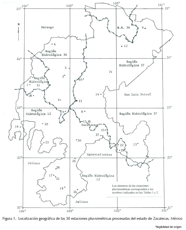 En la figura 1 se indican los parteaguas de las cuatro regiones hidrológicas que comprende el estado de Zacatecas. La región hidrológica num. 11 de los Ríos Presidio y San Pedro que drenan al Océano Pacífico, abarca la porción menor en el oeste del estado, en esa zona únicamente se ubicó la estación Chalchihuites. En la región hidrológica num. 12 Parcial del Río Santiago, que también fluye al Océano Pacífico, se ubican las zonas sur del estado y centro poniente; en esta región se procesaron 15 estaciones pluviométricas.