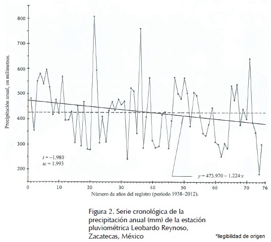 La persistencia puede considerarse una característica estadística del registro que se procesa, la cual se debe tomar en cuenta al realizar el análisis estocástico de la serie, a través de los modelos ARMA (Adeloye y Montasen, 2002; Machiwal y Jha, 2008). Por lo anterior, todas las estaciones pluviométricas que mostraron esta característica no se eliminan. En las figuras 2, 3 y 4 se muestra el comportamiento de los registros de las estaciones Leobardo Reynoso, Gruñidora y El Platanito, las dos primeras presentaron tendencia y la tercera, cambio en la media, según las pruebas TB1 y TB2. La estación Gruñidora solo resultó homogénea en el test de Bartlett. Es importante destacar que cada una de estas tres estaciones pluviométricas que resultaron no homogéneas, pertenecen a las regiones hidrológicas números 36, 37 y 12, respectivamente; indicando con ello que todos los ambientes geográficos del estado de Zacatecas son susceptibles de esas anomalías.