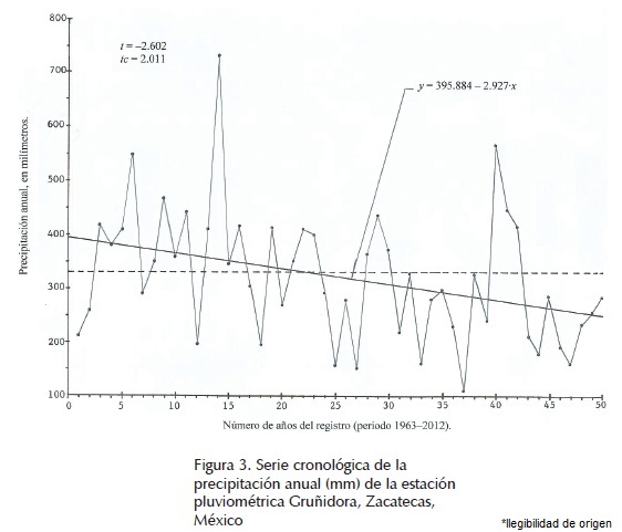 Campos-Aranda, Daniel Francisco. Búsqueda de tendencias en la precipitación anual del estado de Zacatecas, México; en 30 registros con más de 50 años. Ingeniería Investigación y Tecnología, XVI, 03 (2015): 355-368.