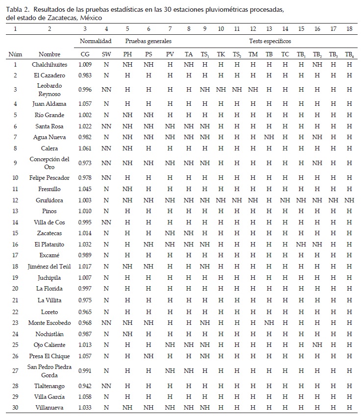 Las pruebas de Helmert (PH) y de las secuencias (PS) detectan si la serie o registro es homogéneo, debido a que no tiene persistencia o tendencia, cambio en la media, o bien, no oscila demasiado. En cambio, la prueba de Von Neumann (PV) es de aleatoriedad contra componentes determinísticas no especificadas. Los resultados de estas pruebas se exponen en las columnas 5 a 7 de la tabla 2, con H para registros homogéneos y con NH para los no homogéneos.