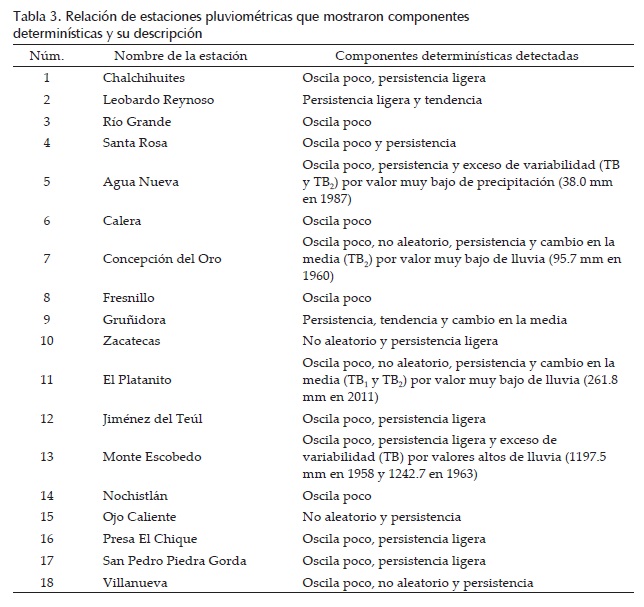 En la tabla 3 se citan las componentes determinísticas detectadas en 18 estaciones pluviométricas que mostraron anomalías según las 14 pruebas estadísticas aplicadas. En general, cuando la prueba de Helmert o la de las Secuencias muestran falta de homogeneidad, se debe a exceso de secuencias y se señala como "oscila poco". Cuando con la prueba de Von Neumann se encontró pérdida de homogeneidad, el registro se indicó como "no aleatorio". Por último, cuando la persistencia se detectó únicamente con alguna de las dos pruebas, se señaló como "persistencia ligera".