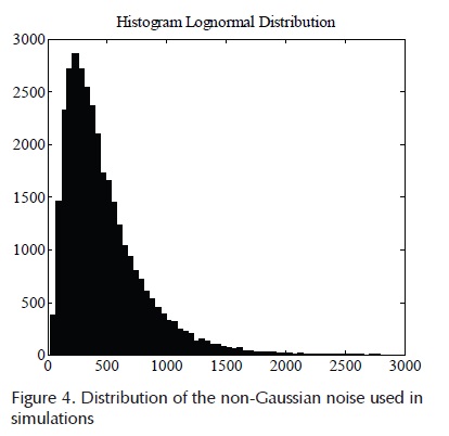 The cumulants of the preamble autocorrelation, cyp (which is effectively the cumulants of yp given by Equation 6), are determined in a similar fashion to the preambles in Equation 1. Of theoretical interest is the assumption that the random variables η(i) and μ(i) are independent and identically distributed (i.d.d.) (Giannakis and Tsatsanis, 1990). Under this assumption, c2,η (j-i1) = ση2δ(j-i1) and c2,μ (j-i1) = σμ2δ(j-i1) where ση2 and σμ2 are the variance of the processes and δ(j-i1) is the 1-D delta function. On the other hand, the third-order cumulant in Equation 10 c3,y(μ+η) depends only on the non-Gaussian noise cumulant c3,μ (j1 i1,j2-i2) = γμδ (j1 i1,j2-i2) where γμ is the skewness of the non-Gaussian noise and δ (j1 i1,j2-i2) the 2-D delta function. The third-order cumulant of the Gaussian-noise c3,μ(j1i1,j2-i2) is equal to zero. Nonetheless, the result of the insensitivity to Gaussian noise in Equation 10 is not satisfied for a finite number of samples but in the mean of a large number of independent records (Nikias and Petropulu, 1993; Giannakis and Tsatsanis, 1990). It is woth mentioning that statistical analysis based on the bispectra shown in a following section presents asymptotic independence for lengths lower than the preamble size of interest, in agreement with results in Hinich and Wilson (1990).