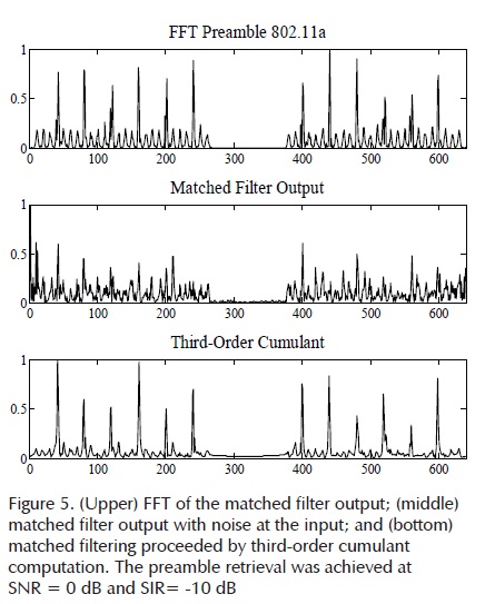 To test both detectors, the input sequence of the preamble is combined linearly with input noise sources of zero mean. The sample rate of the preamble sequences shown in Figure 4 is inversely proportional to the Gaussian noise bandwidth. Receiver floor noise is defined for a given SNR. Non-Gaussian interference is included by setting a signal-to-interference ratio (SIR) and the same sampling rate. In our simulations samples of non-Gaussian noise are produced by a random process characterized by a Lognormal distribution. The use of this distribution facilitates testing the detectors as it allows simulating broadband stationary non-Gaussian interference which is often characterized by a large positive skewness and a long-tail distribution (Primak et al., 2004). Figure 5 displays the reconstruction of the 802.11a preamble achieved at SNR = 0 dB and SIR= -10 dB. It is seen that the third-order cumulant processing of the matched filter output improves preamble reconstruction compared with that based on the matched filter structure. It is apparent that OFDMA tones are best reconstructed. Some noise components are filtered out which result from the high energy of the third-order cumulant. It is important to mention that at high SNR ratios (results not shown herein) the scheme based on the third-order cumulant cannot improve the preamble reconstruction to any further extent. This is due to fact that the preamble cumulant is not an ideal impulse function (Figure 3). However; the following statistical analysis of the preamble detector confirms its effectiveness.
