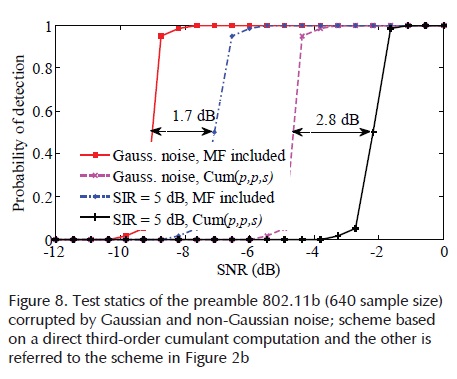 The energy detection of the preamble sequence is not optimal when non-Gaussian noise is present at the input. On the other hand, the benefit of the preamble detection based on bispectra-based statistics is obtained when larger preamble lengths are used (for example 640 sample points, see Figure 7) and the preamble or its autocorrelation function is characterized by large a skewness. However, the preamble 802.11b and its autocorrelation function have low skewness coefficients, which results in a probability detection equal to 1 at higher SNR (> -9 dB, see Figure 8 for the detector including MF). Notice that the dense level is slightly lower to that obtained by energy detection. Figure 8 also shows changes in desense levels when non-Gaussian noise of power equal -5 dB are added at the input. The reduction in the desense is about 1.7dB.