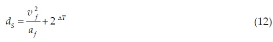 where αf and vf are the acceleration and speed of the following vehicle and ΔT is the time step at which the status of the leader vehicle is obtained.