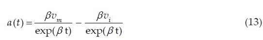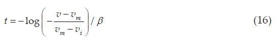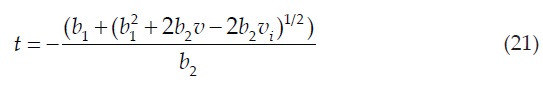 with β = α/vm, being α the maximum acceleration, vm the maximum speed, β the rate at which decreases the acceleration respect the speed, and vi is the initial speed. The time can be solved manipulating Equation 14,