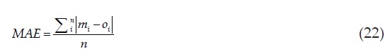 The equation employed to obtain the mean absolute error is presented in Equation 22, where oi is the observed value, mi is the modeled value, and n is the total number of observations.
