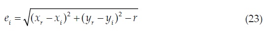 Table 3 presents the models that explains the heading angle of the vehicle in a curve, together with statistical results -adjusted R-squared and MAE. With the objective to test the accuracy of the models presented in Table 3, an autonomous vehicle with a fixed speed of 10 m/s is provided with the corresponding model for each curve case, the trajectory is measured and it is verified that the vehicle stays inside the lane. The case of a curve with a 100 m radius is presented in Figure 19, where the autonomous vehicle trajectory is presented in red and the lane borders in black, the lane width measure is 7.5 m for all the experiments. The trajectory 100 m radius case, presented in Figure 20, is measured according the Euclidian distance between the origin of the curve (xr, yr) and the points obtained from the vehicle trajectory (xi yi) minus the radius size, since the width of the lane is 7.5 m and the autonomous vehicle measure 2 m of width and 4 m of length, the permissible distance to avoid leaving the lane is a displacement of 2.75 m from the center of the lane, the equation to obtain the error is Equation 23.