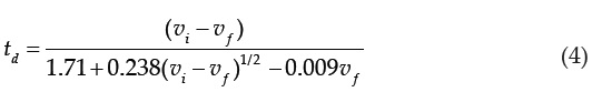 In the case for decelerating the leader car the same model presented in Equation 1 is employed, explained in Akcelik & Besley (2001), with the variant that instead of tα, td the required time to reach a zero final speed, is estimated with Equation 4.