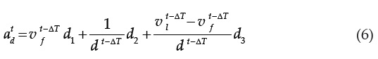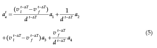 where d is the distance between the leader and the following car, measured from the centers of the cars, the parameters of the model are α1 α2, α3 and α4 and ΔT = 1 is the reaction time, i.e. the time that the driver needs to react. In the second case, the deceleration of the following vehicle is presented in Equation 6,