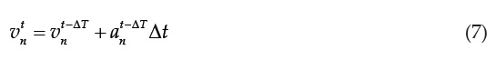 After the acceleration or deceleration is calculated, the speed is obtained with the Newton's law of motion, discretized in time and presented in Equation 7, where Δt » 0.2s is the step simulation time.